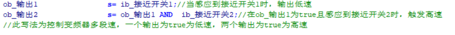 變頻器多段速控制,當(dāng)感應(yīng)到接近開關(guān)1時,低速運行,在運行的過程中,碰到了接近開關(guān)2,高速運行,可以采用兩種思路進行寫程序,第一種是硬接線控制,接近開關(guān)感應(yīng)到,PLC立即輸出相應(yīng)的端子,從而控制速度,另外一種是,通訊寫入頻率,當(dāng)感應(yīng)到接近開關(guān)1時,寫入預(yù)設(shè)好的低速頻率,感應(yīng)到接近開關(guān)2時,寫入預(yù)設(shè)好的高速頻率。